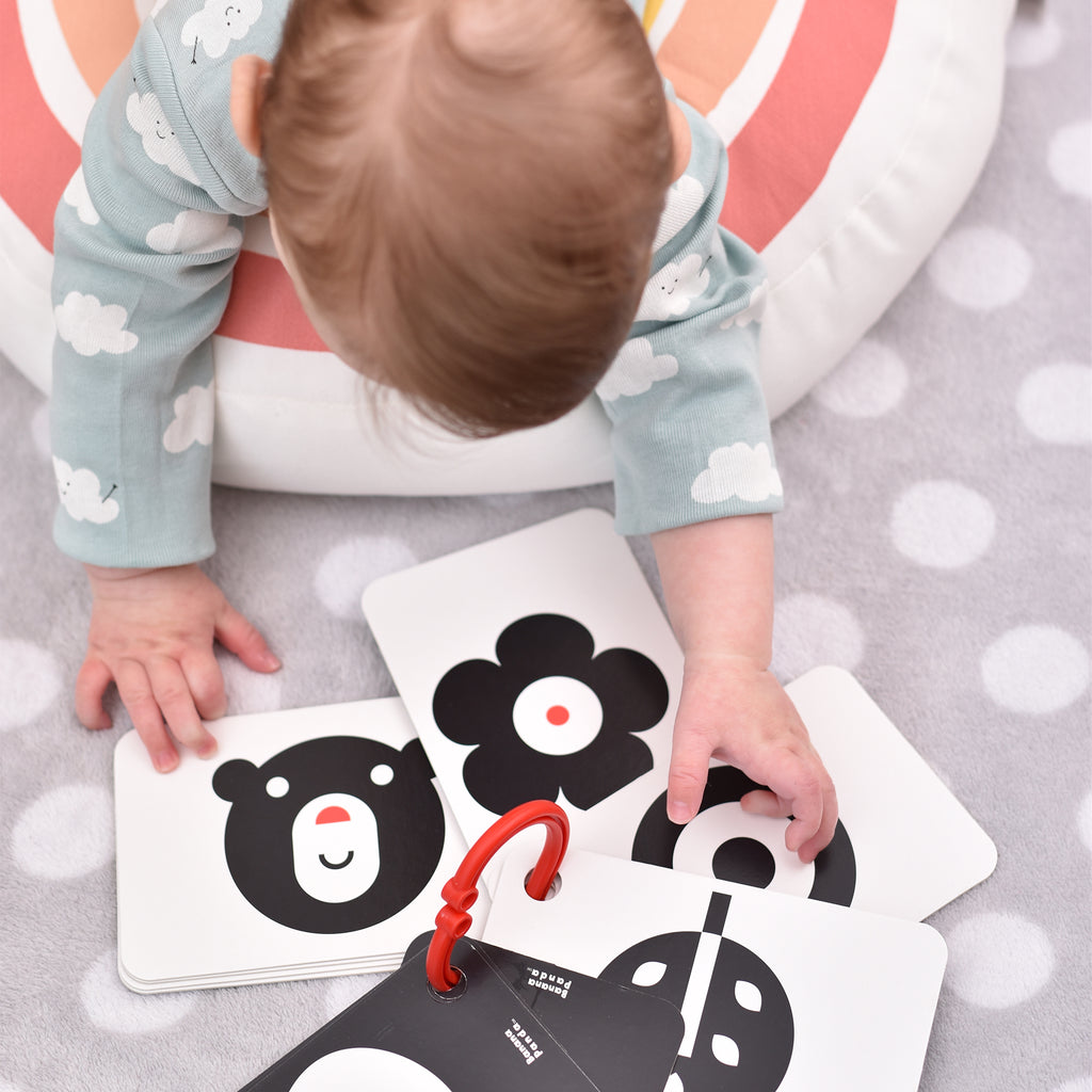 These double-sided flash cards with twenty large illustrations are suitable for the smallest infants, who can only see high contrast colors and distinct contours. Simple, clear patterns, adjusted to the visual perception of young infants, engage baby’s attention and support visual development. Thanks to the plastic ring, you can also hang the cards next to baby’s bed or stroller, or on a mobile.